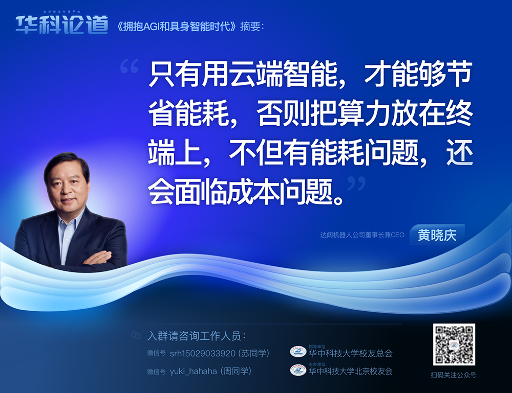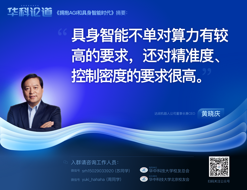 作为华中科技大学的杰出校友,黄晓庆凭借其在人工智能领域的深厚积累和全球视野,为校友们提供了宝贵的思考和启示。在演讲中他展示了面向未来的思维,也体现出他对认准的方向有魄力去追求和实现的毅力。他的分享为未来具身智能机器人与社会发展的融合提供了新方向,也为人形机器人技术的发展方向提供了新思路。华科论道活动一直致力于为校友搭建知识交流平台,推动科技创新与社会发展,此次活动再次彰显了其价值与使命。